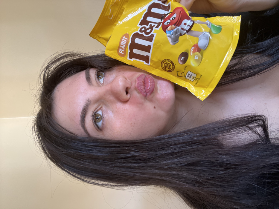 The scene depicts a close-up, indoor portrait of one individual in Unknown, Unknown. The subject is a female with long, dark brown hair and light brown eyes, visible from the upper chest upwards. She is looking upwards and to the right, with her lips pursed in a puckered expression. Her left shoulder and upper chest are visible, under what appears to be a dark garment. She holds two yellow bags of "PEANUT M&M's" in her right hand, positioned in the lower right portion of the frame, partially obscuring her lower face. The bags clearly display the "M&M's" logo and the red M&M character. The background consists of a plain, light beige wall with a faint vertical line on the right side, suggesting an interior wall or door frame.