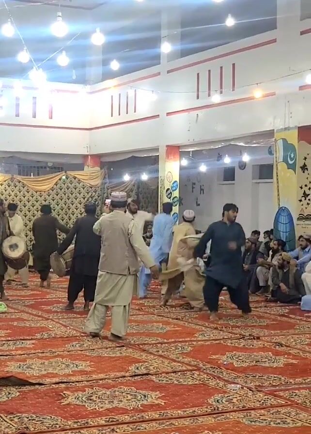 In a brightly lit indoor space, a group of men are dancing and playing drums on a large red and gold patterned rug. The room has white walls, red trim, and numerous light bulbs hanging from the ceiling. Some men are wearing traditional Pakistani clothing, while others wear more modern attire. A curtained backdrop can be seen in the background, with some people seated watching the performance. A few individuals are recording the event with their phones.