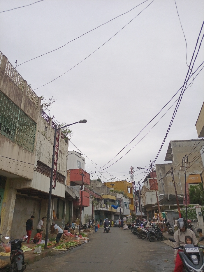 A bustling street scene under a cloudy sky. Buildings line both sides, weathered and of varying heights. Vendors are selling goods along the left sidewalk. Motorbikes are parked and driving through the street. Numerous overhead power lines crisscross the sky. A cellular tower is visible in the distance. A rider on a scooter drives towards the viewer.