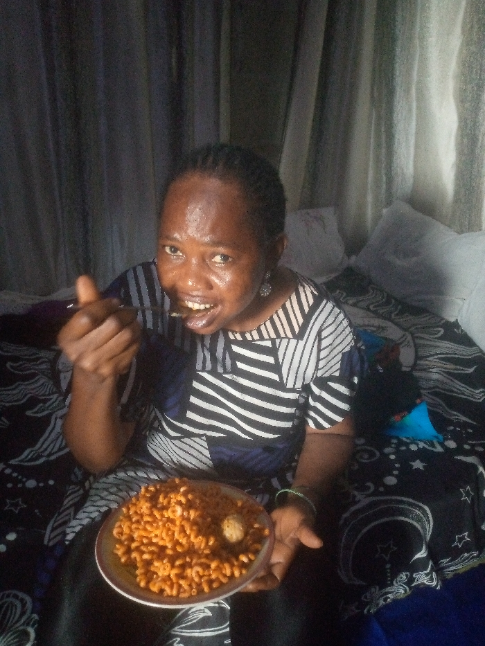 An adult female is depicted from the waist up, seated indoors on a bed in Iranla, Nigeria. She has dark skin, short dark braided hair, and is wearing a patterned short-sleeved top with black, white, and blue/purple geometric designs. Her forehead exhibits a sheen, possibly indicating sweat or oil. She wears earrings and a green bracelet on her left wrist. The subject is looking directly at the camera with her mouth slightly open, actively eating. She holds a white plate containing orange-colored macaroni pasta in her left hand, which rests on her lap. One spherical object, possibly a small meatball or boiled egg, is visible within the pasta on the plate. Her right hand holds a spoon, which is positioned near her open mouth, suggesting the act of bringing food to her mouth. The background shows a dark patterned blanket or bedspread beneath her, featuring white celestial or abstract designs (stars, moons). Two white pillows are visible behind her on the bed. Further back, a curtain with vertical light and dark stripes is visible, suggesting a window or room divider. The lighting appears to be ambient, originating from the front, illuminating the subject.