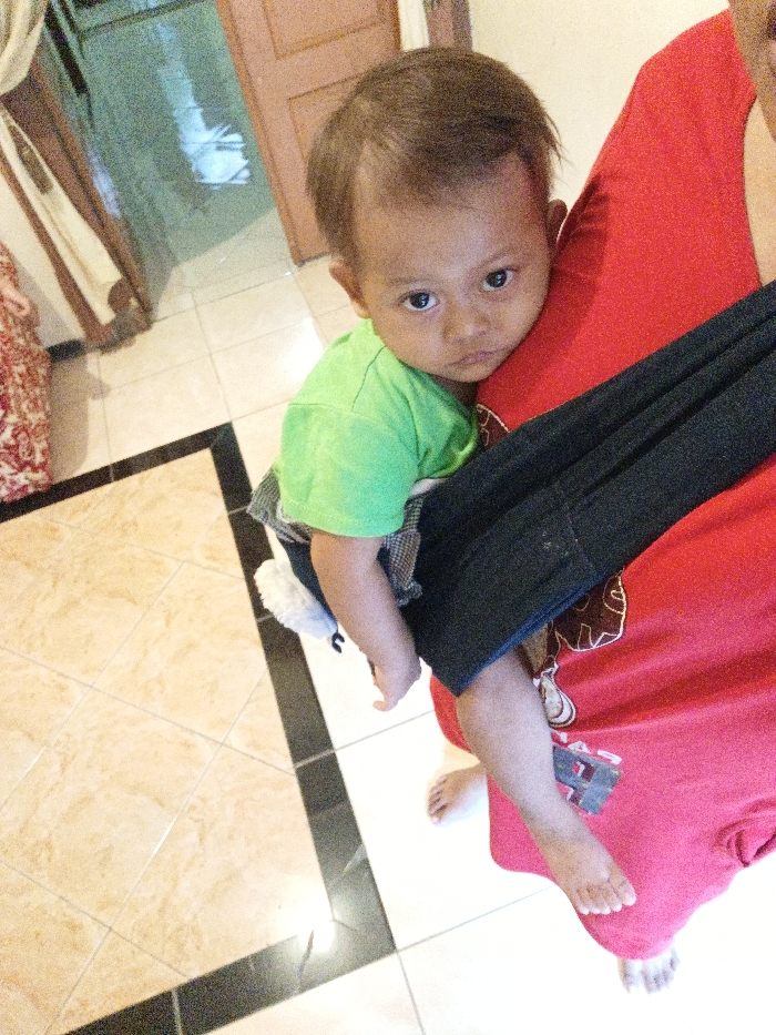 - "An indoor, high-angle photograph, likely taken in a residence in Kecamatan Pati, Indonesia, depicts a partial view of an adult holding an infant" by FM-qAby52, licensed under CC BY 4.0