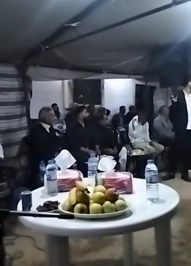 gathering inside a tent-like structure, possibly an event or celebration. There are several men sitting in chairs around the perimeter of the room. A man stands at the front speaking into a microphone. Then, three men begin dancing in the center of the room. There is a small table in the foreground with water bottles, tissue boxes, and a plate of fruit. In the background, there is a soundboard with someone operating it. The lighting is somewhat dim, and the overall atmosphere appears lively and celebratory.