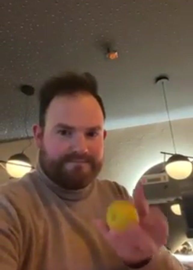 man in a beige turtleneck sweater, holding a yellow lemon in his right hand and looking at the camera. He has short dark hair and a beard. The background shows a speckled gray ceiling with hanging pendant lights and a round mirror on the wall. There is noise in the background.