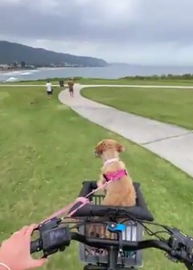 A person is riding an electric bike on a paved pathway through a grassy area. A small, light brown dog wearing a pink harness is seated in a basket mounted on the front of the bike. The rider's hands are visible on the bike's handlebars, which include a digital display and control mechanisms. In the distance, two people are walking along the same path, and beyond them, there is a coastal view with a beach, waves, and mountains under a cloudy sky.