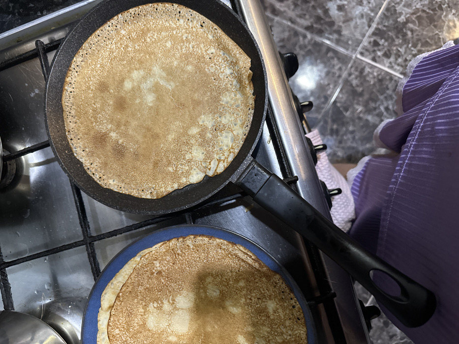 The image displays a domestic kitchen scene viewed from above, centered on food preparation on a gas stove. Two round, golden-brown pancakes or crepes are visible. One is positioned on a blue plate on the left burner, while the second is actively cooking in a black frying pan on the right burner. Both pancakes exhibit a bubbly, textured surface with varying shades of brown from cooking. The black frying pan has a prominent black handle extending towards the bottom left. The gas stove features black metal grates. Beneath the stove, a stainless steel panel is visible, with control knobs along its lower edge. The floor beneath the stove is composed of dark grey or black tiles with lighter veining. A portion of a person's lower body is visible in the foreground, wearing a pleated, light purple garment with white trim. A light-colored, possibly white or pink, textured cloth is partially visible on the floor beneath the stove. No specific identifying features within the image indicate its location in Kazan, Russia.