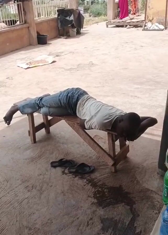 person lying prone on a small wooden bench outdoors. The person is wearing a light-colored shirt and jeans. Their hands are behind their head. A pair of sandals is on the ground beside the bench. There are two people standing in the background near a white railing; one is wearing a pink garment and the other a patterned one. The ground is concrete and has a few dark stains. Behind the railing are several buildings and trees. There is a white sheet or cloth on the ground to the left of the bench.