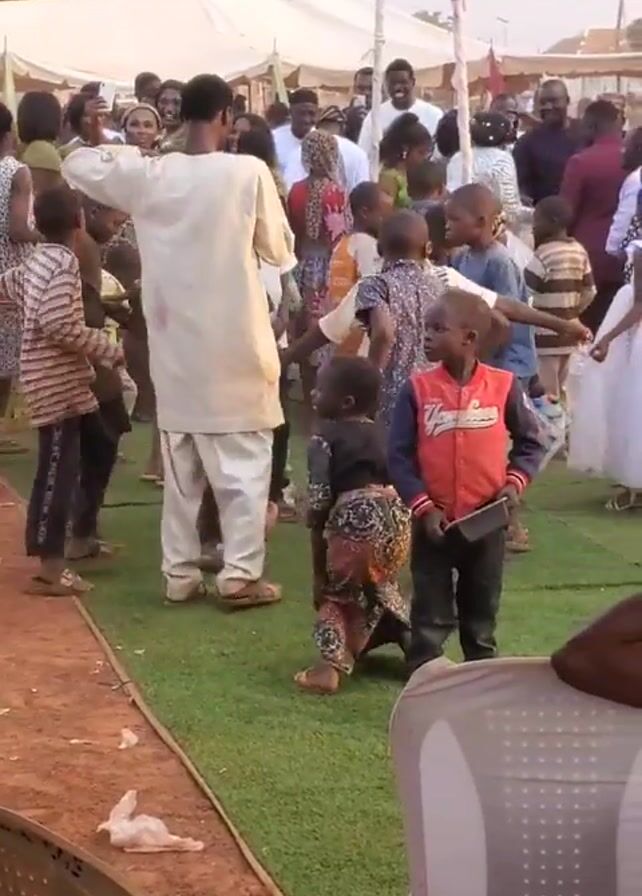gathering of people, mostly children, under a large white tent. A man in a light-colored traditional outfit dances with the kids, moving his arms expressively. Most of the children are looking at the dancer while some are looking around. There is an artificial green turf surface near the edge of the tent, and the surrounding area is dirt. Chairs are visible on the perimeter, suggesting a seated audience or spectators. The overall atmosphere seems festive and lively.