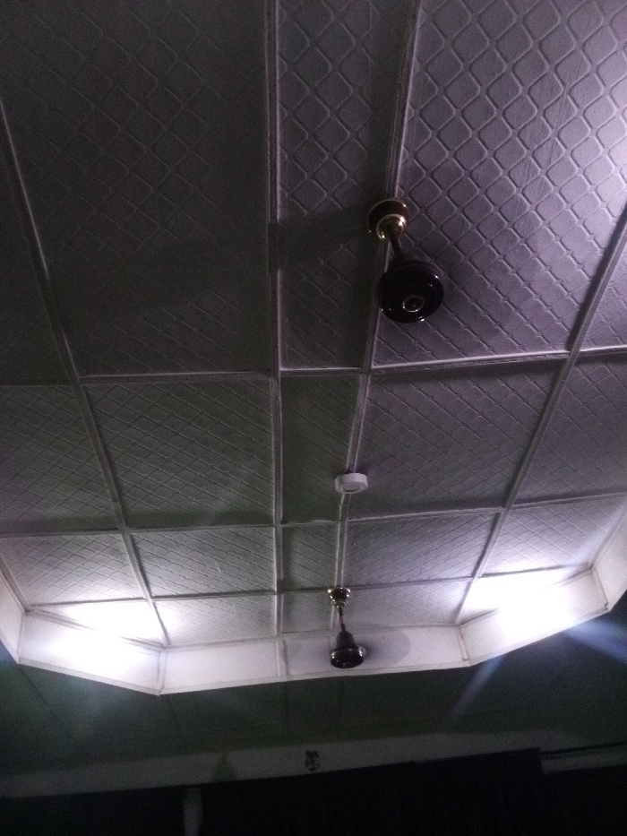 A low-angle shot reveals a ceiling with a grid of square panels. The panels have a textured, diamond-like pattern. Two dark-colored ceiling fans are visible, one closer to the viewer and one further away. A white light fixture is positioned near the far fan. The perimeter of the ceiling appears to have a luminous strip, creating a bright edge. The bottom of the frame is obscured by darkness.