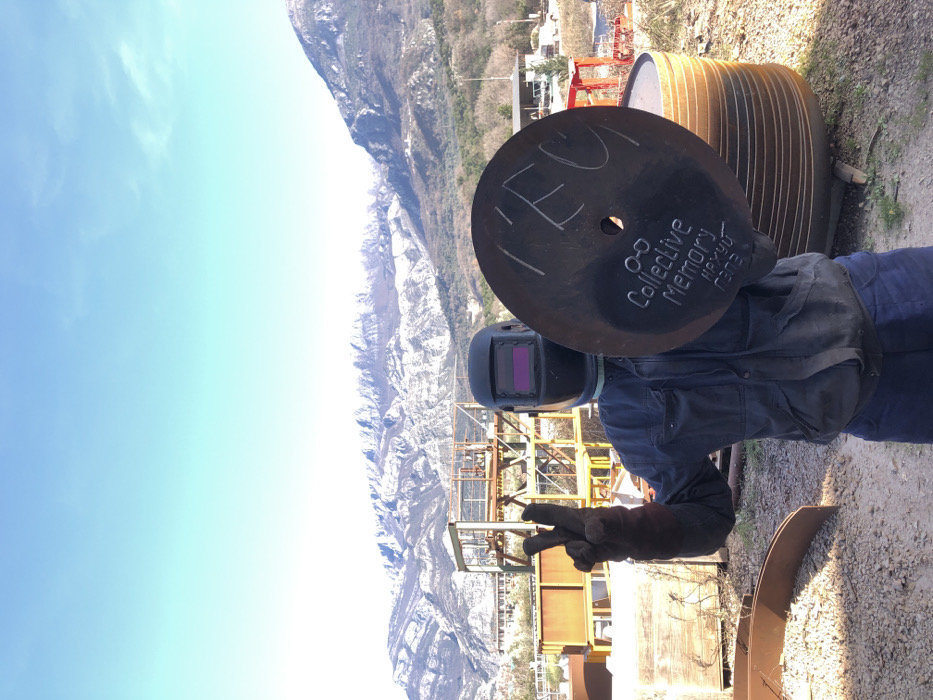 The image depicts a man on an industrial site in Zaljevo, Montenegro, under a clear blue sky with snow-capped mountains in the distant background. The man, seen from the chest up, wears a dark blue work jacket, dark gloves, and a black welding helmet with a purple-tinted visor. With his gloved left hand, he makes a "V" (peace) sign. In his gloved right hand, he holds a large, dark, circular metal disc with a central hole. Embossed or etched onto the disc are the words "Collective Memory" and other characters, including "TECИ" and likely "Нахуй Папа" in Cyrillic. Behind the man, various industrial materials and structures are visible, including rusty metal scaffolding, large cylindrical metal components, and stacked wooden planks. The terrain is rough, appearing to be dirt or gravel.