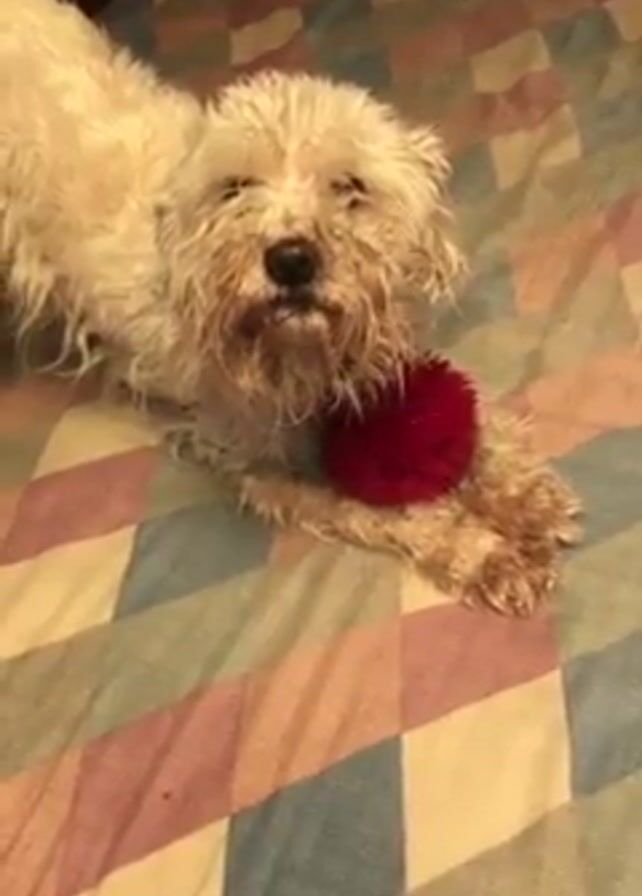 A small, fluffy, cream-colored dog lies on a bed with a patterned blanket. The dog has a red pom-pom toy near its front paws and is looking directly at the camera. The dog's fur appears to be slightly damp or messy. The blanket has a diamond pattern with alternating colors of cream, rose, and pale blue. The lighting is soft and appears to be from an indoor source.