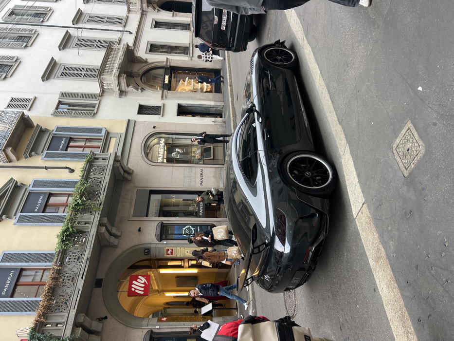 A dark grey Mercedes-AMG GT R sports car is centrally positioned on a paved street, angled slightly towards the right side of the frame. It features a prominent rear spoiler, black multi-spoke wheels with silver outer rims, and tinted windows. A black Cadillac Escalade SUV with a Swiss license plate (GE-143388) is visible behind it. The street is Via Montenapoleone, 19, Milan, Italy, identifiable by the prominent "illy" cafe signage within an arched entrance and the adjacent "Panerai" watch boutique. The architecture consists of multi-story buildings. The building on the left, painted light yellow, features a decorative balcony adorned with greenery and multiple windows with grey louvered shutters, some displaying "PANERAI" branding. The building on the right is light-colored and also has numerous windows with grey louvered shutters, and a store marked "LOEWE" is visible further down the street. Numerous pedestrians are present on the sidewalks. On the left, individuals are walking towards and away from the "illy" entrance, some carrying shopping bags. A person in the immediate foreground on the left, partially obscured, wears a beige backpack with red straps. On the right sidewalk, a man in a dark suit stands outside the "Panerai" store, while other pedestrians, including one in a black and white patterned jacket, are further down the street. The scene depicts a bustling luxury shopping district.