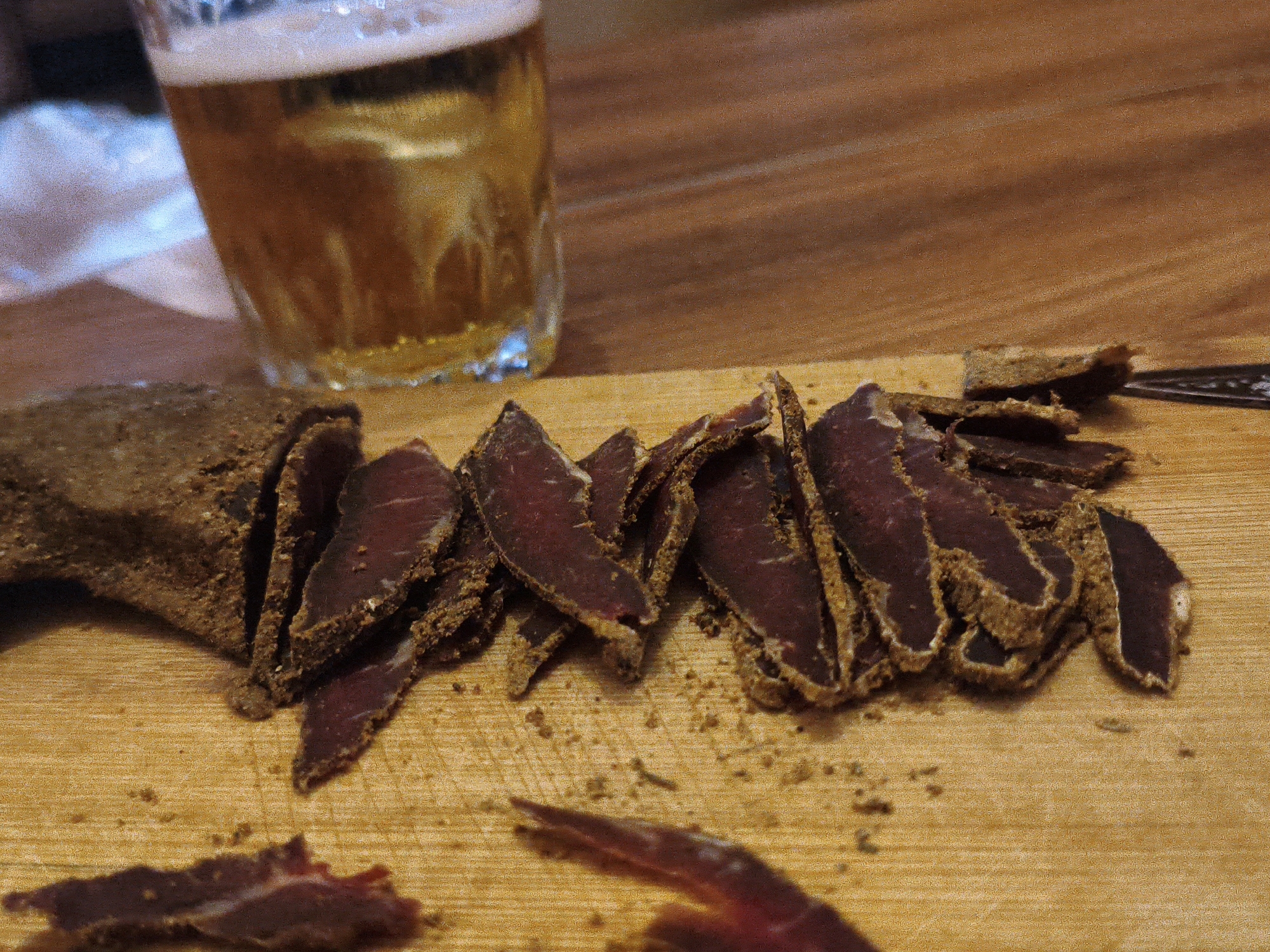 A close-up shot shows a wooden cutting board laden with sliced, dark red meat, possibly beef jerky, featuring a heavily seasoned, textured edge. The meat is arranged in a semi-organized pile towards the center of the board. Crumbs and small pieces of the seasoning are scattered around the slices. In the background, out of focus, sits a glass of amber-colored beer with a frothy head. A partial view of a table with a wood-grain surface is visible behind the cutting board. Based on the user prompt, this scene is supposedly in Tervel, Bulgaria, though this information cannot be visually verified.