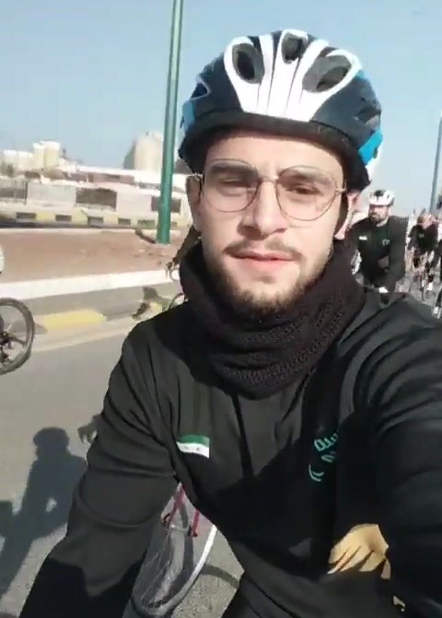 group of people riding bicycles on a sunny day. The person filming the video is among the cyclists, wearing a helmet, glasses, and a black scarf. They are dressed in a black long-sleeved shirt with a small green and white flag on the sleeve. Other cyclists are visible in the background, many also wearing helmets. Palm trees line the side of the road, and a few cars are visible in the distance. The group appears to be cycling together along a paved road.