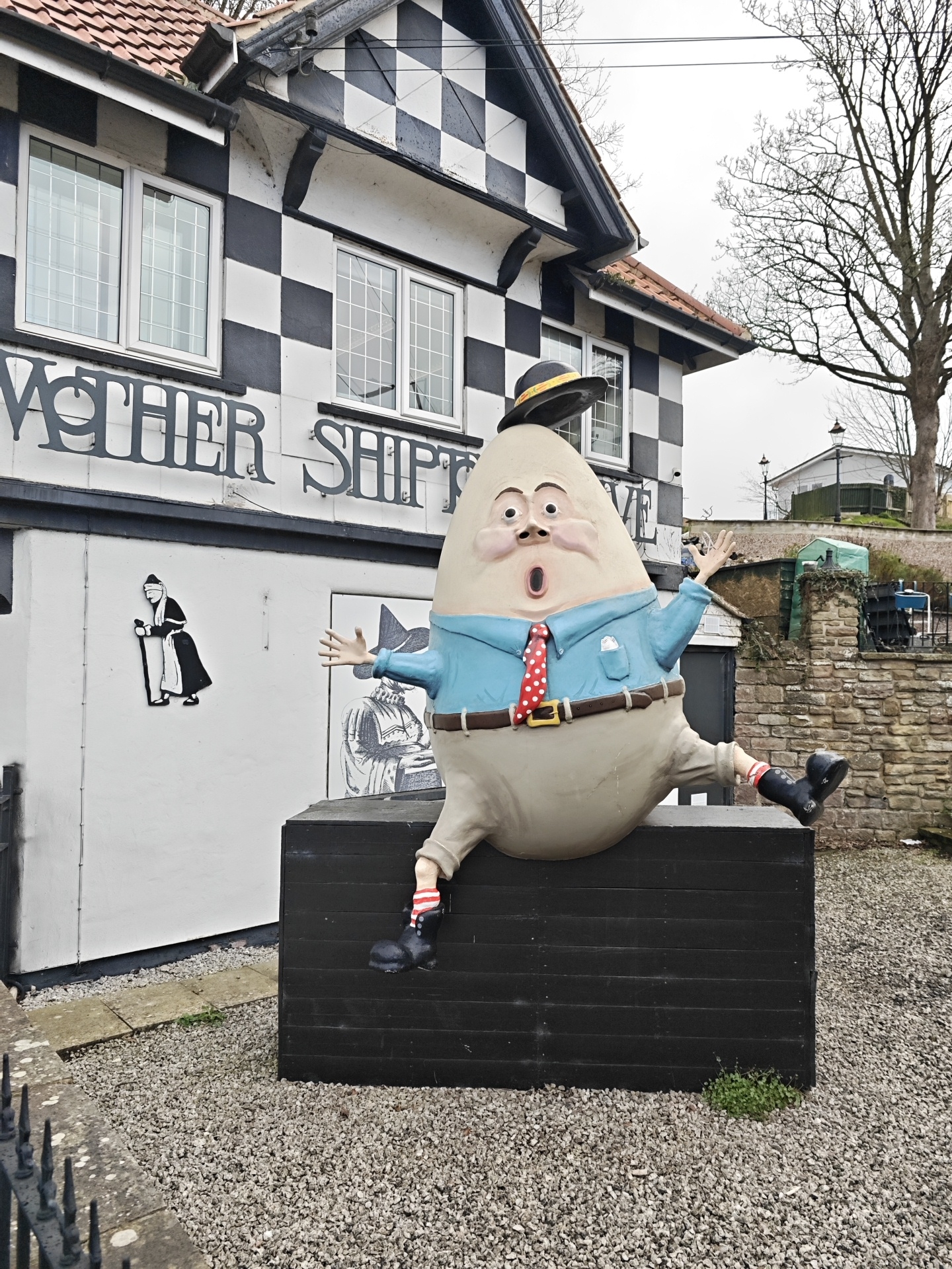 The image depicts a statue of Humpty Dumpty sitting atop a black box-shaped structure in front of the Mother Shipton Inn in Knaresborough, United Kingdom. Humpty Dumpty is wearing a blue shirt, a red polka-dotted tie, beige trousers, and black shoes with striped socks. A hat is precariously balanced on his head. The building behind the statue has a black and white checkered design and lettering which reads "Mother Shipton". To the left of the statue, there is a black and white image of Mother Shipton on the wall. The ground is covered in gravel. A stone wall and trees are visible in the background.