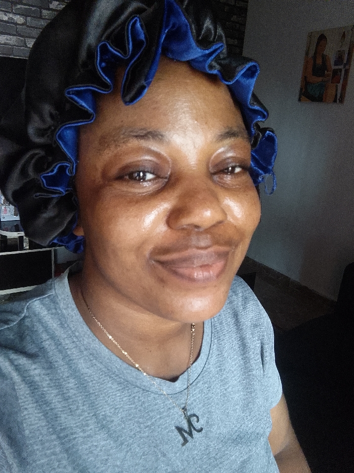 The image depicts an indoor scene in Warri, Nigeria, featuring a close-up portrait of an individual. The subject is a person with medium-brown skin, wearing a black satin bonnet with a blue ruffled trim, and a grey short-sleeved t-shirt. A gold-colored chain necklace with an "MC" initial pendant is visible around the neck. The individual is facing forward, looking towards the camera with a subtle smile. The background consists of two wall sections: a dark grey textured wall to the viewer's left and a plain light grey wall to the viewer's right. On the plain wall, a framed picture depicting another individual is partially visible. A dark, rectangular object is also discernible in the lower-left background.