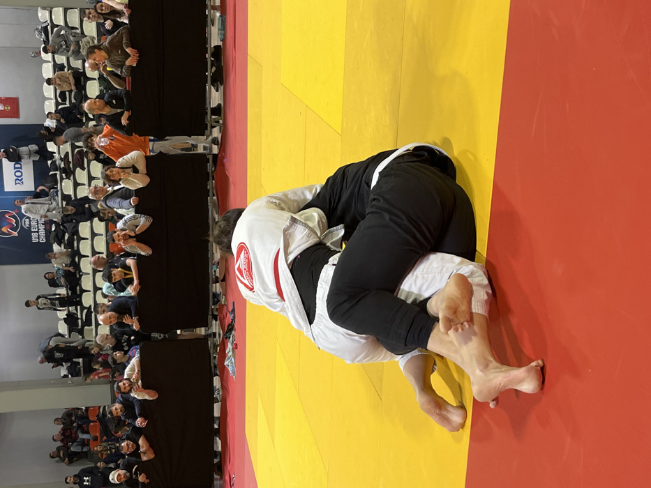 - "Two individuals are engaged in a grappling match on a mat composed of red and yellow sections" by FM-BivpG3, licensed under CC BY 4.0