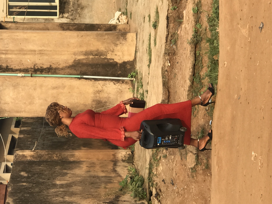 A woman in a long red dress and black heels carries a black speaker with wheels. She holds a black purse in her other hand. The setting appears to be an outdoor area near a building with concrete walls and some vegetation. The ground is a mix of dirt and concrete. The photo is taken in landscape orientation.