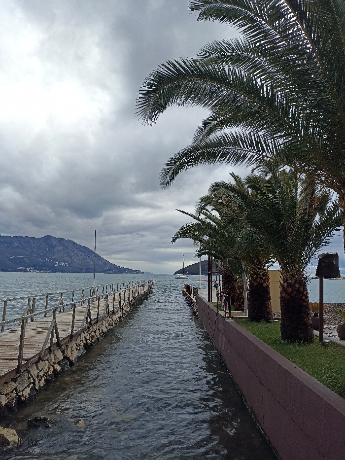 The image displays a coastal waterfront scene in Budva, Montenegro, under an overcast sky. A narrow channel of water extends from the foreground into a larger body of water towards the horizon. On the left, a wooden pier with railings, constructed on a stone foundation, projects into the water. On the right, a dark reddish-brown retaining wall runs parallel to the water, bordering a strip of green grass. A row of at least five mature palm trees, characterized by thick dark trunks and green fronds, stands on this grassy area. A tall, slender pole with a dark, box-like fixture is situated amongst the palm trees. The water surface exhibits ripples. In the middle distance, a white boat with a visible mast is present on the open water. The far background features a prominent mountainous coastline, appearing dark green and blue-grey, with sparse structures visible on its lower slopes to the left. The sky is largely covered by dense, grey and white clouds. No individuals are visible in the scene.