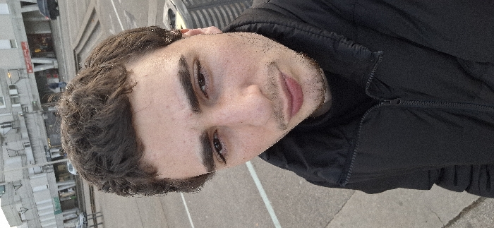 A rotated selfie of a man with dark hair and brown eyes is captured outdoors. He's wearing a dark jacket. The background includes a street with visible lane markings, a building with multiple windows, and a glimpse of a vehicle. His expression is relaxed, with a slight smile. The overall image quality is somewhat grainy.