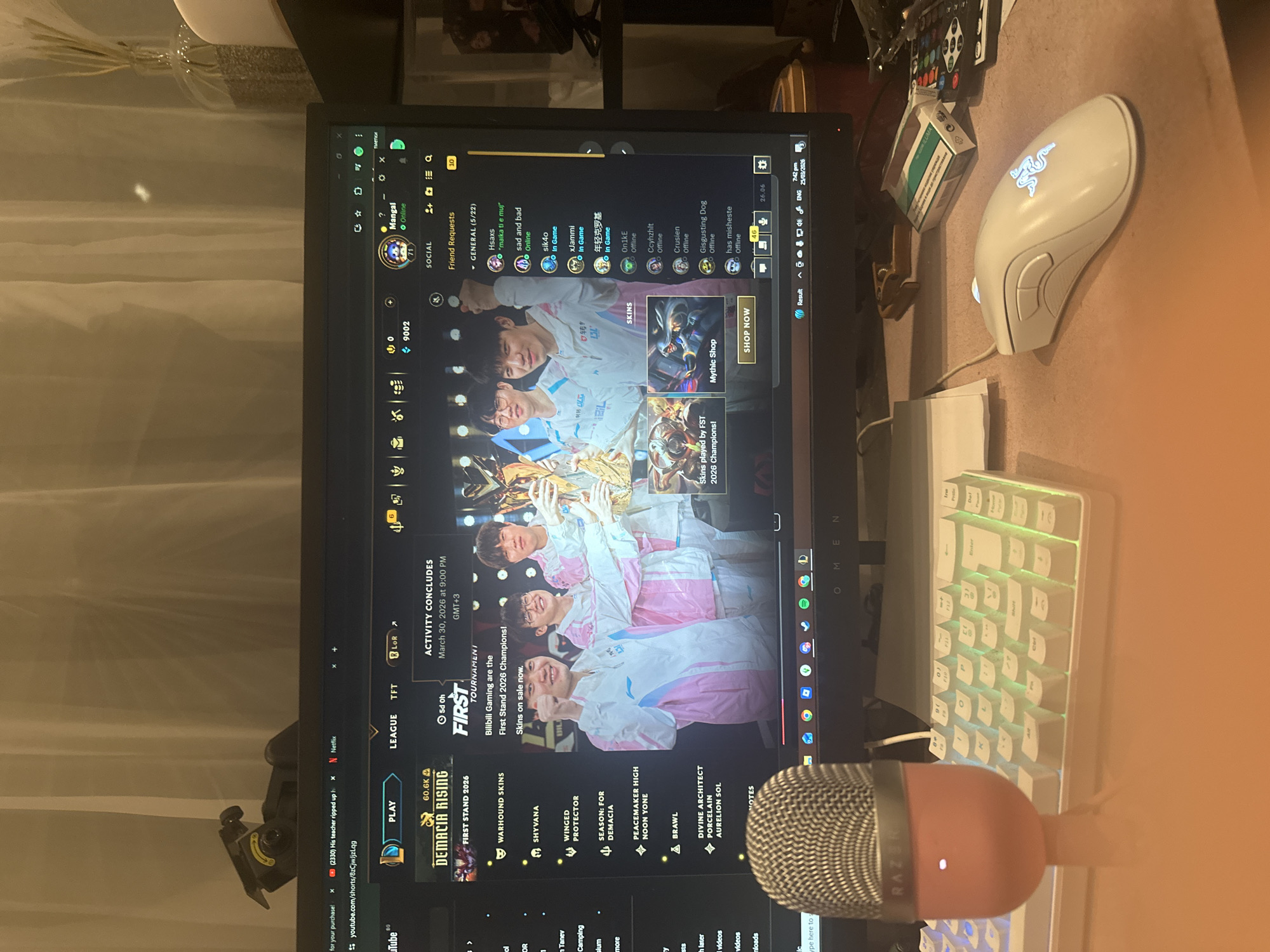 The image displays an indoor desk setup, primarily focused on a computer monitor and peripheral devices, suggesting a personal gaming or computer workstation. The ambient lighting is dim. The central subject is a black OMEN-branded computer monitor, displaying the League of Legends client. The client shows a featured advertisement for the "FIRST STAND 2026 Tournament," declaring "Bilibili Gaming are the First Stand 2026 Champions!" and featuring four young East Asian males, two holding a large golden trophy, all wearing athletic jackets. The left panel of the client lists various game content and modes, including "DEMACIA RISING" and "WARHOUND SKINS." The right side of the client shows a social panel with a friend list, where one user named "Mangal" is online, and another, "Hsaxs," has a status message containing the Bulgarian phrase "maika ti e muj." The taskbar at the bottom right of the monitor shows the time as "7:42 PM" on "25/03/2026," with "ENG" for English input. Browser tabs are visible above the client, one open to YouTube with a title including "(2330) His teacher ripped up !". A black webcam or similar device is clipped to the top center of the monitor. On the desk surface in the foreground, from left to right: a light pink/peach Razer Seiren Mini microphone with an illuminated indicator light; a white mechanical keyboard with green RGB backlighting; and a white Razer DeathAdder V2 Pro wireless gaming mouse with an illuminated Razer logo. Behind the mouse, a white and green pack of "L&M" brand cigarettes is present. To the right of the cigarettes is a multi-colored remote control. A loose sheet of white paper lies to the left of the keyboard. In the background, behind the monitor, light-colored, sheer curtains are visible. To the right, a dark shelf unit holds a clear glass vase containing dried ornamental reeds and a white, possibly ceramic, object. The time and date displayed (25/03/2026 7:42 PM), coupled with the League of Legends client's "GMT+3" notation for an activity ending on March 30, 2026, and the presence of a Bulgarian phrase in the social panel, are consistent with a location in Varna, Bulgaria, which observes GMT+2 or GMT+3 during Daylight Saving Time, typically starting in late March.