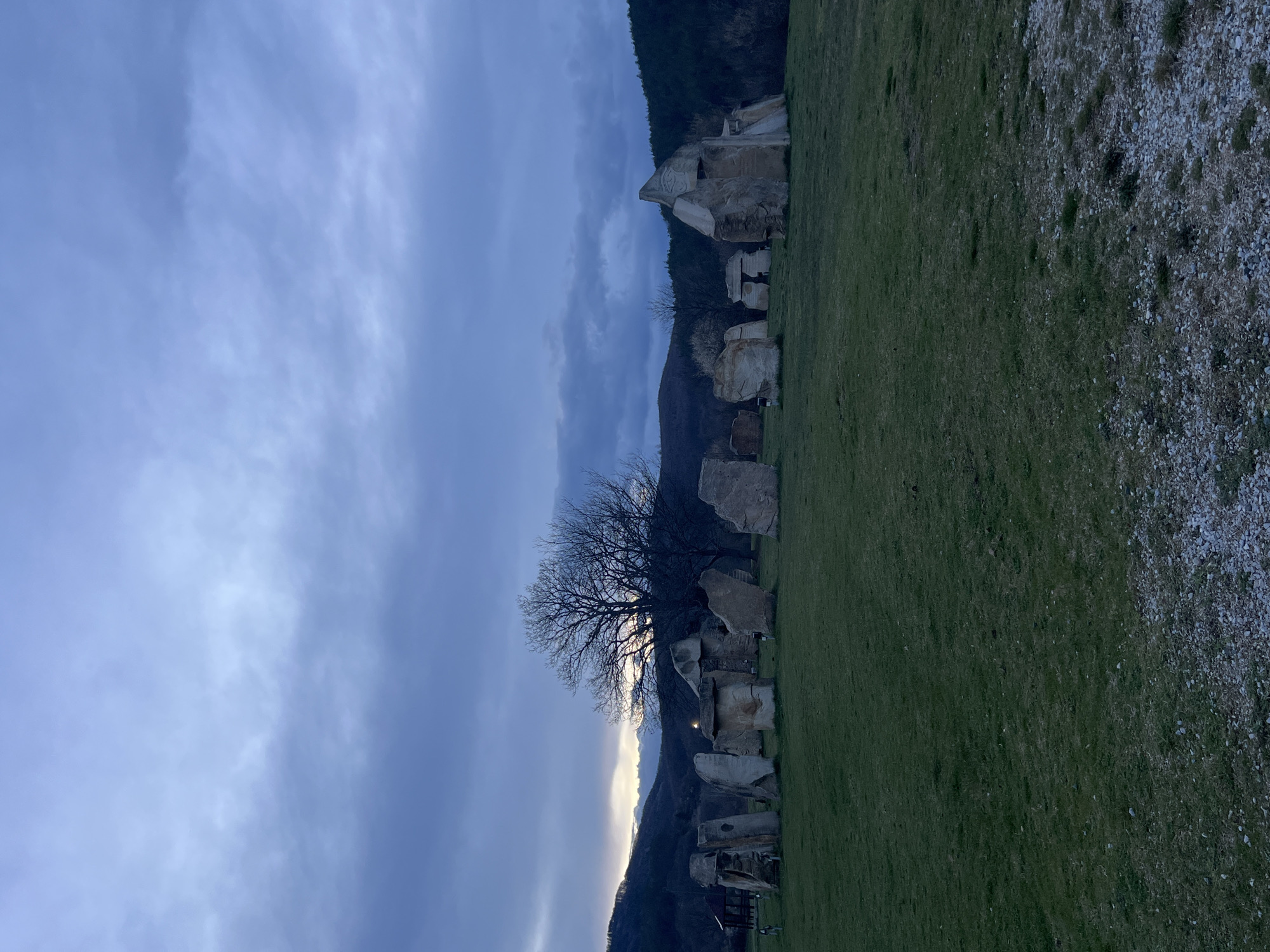 Thracian cult complex Orlovi Skali near Gardevtsi, Bulgaria. The scene depicts a field of green grass, with scattered white stones, trees, and a mountain range in the background under a cloudy sky. The sun is setting behind the mountains, casting a bright glow. The stones are arranged in a deliberate manner, suggesting the ancient cult complex. There are no people or animals visible.