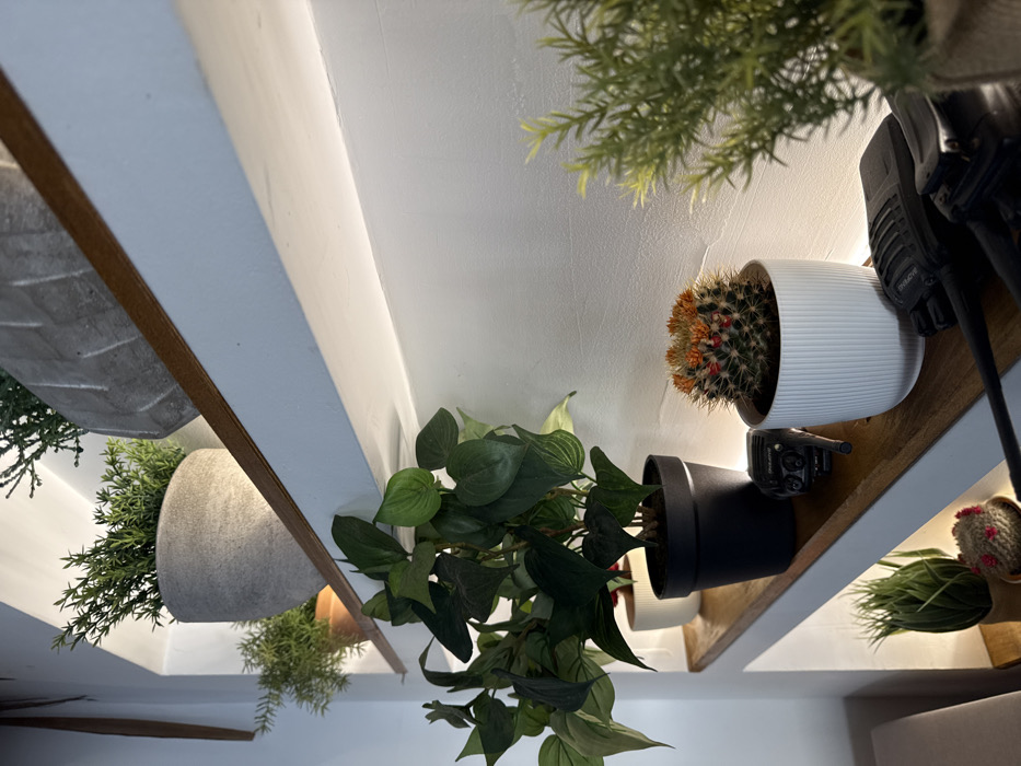 The scene depicts an interior wall in Petrovac na Moru, Montenegro, featuring multiple recessed wooden shelves illuminated by integrated LED strip lighting. The wall is white and textured. On the uppermost visible shelf, a large grey textured pot contains a dense green plant. Below this, on the middle shelf, from left to right: a green leafy plant in a black pot, a small black electronic device (possibly a two-way radio), a globular cactus with orange-red blooms in a white fluted pot, and two black Midland XT70 two-way radios lying flat. Partially visible behind the radios is a green plant in a woven pot. On the lower visible shelf, a spiky green plant in a light-colored pot and a small fuzzy pink object in a brown fabric pot are present. The lighting originates from beneath each wooden shelf, casting an upward glow on the items and the white wall above, creating a decorative display. No individuals are present in the scene.
