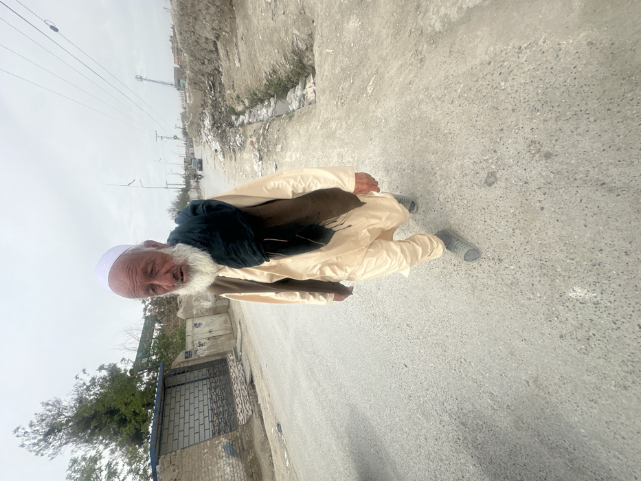 The image displays an elderly man walking on a paved road in Quetta City Tehsil, Pakistan, under an overcast sky