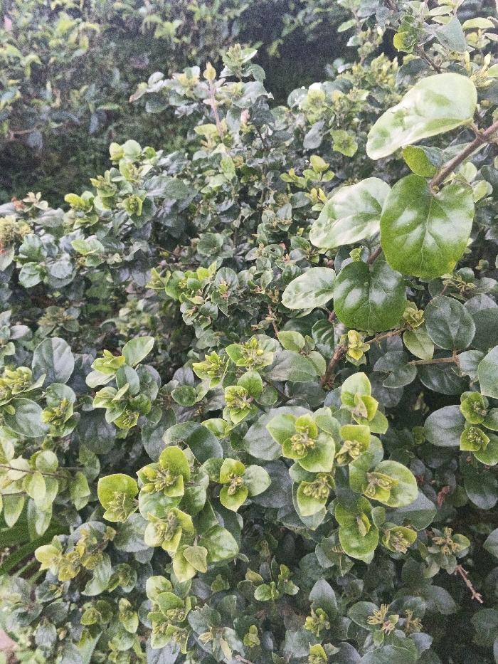 Lush green shrubbery fills the frame, dominated by rounded leaves ranging in shade from deep emerald to bright lime. Many leaves show a glossy sheen, reflecting light, while others have a matte finish. Small, bud-like structures emerge from many of the clusters of leaves, hinting at potential blooms. The foliage is dense and appears well-maintained, creating a uniform texture.