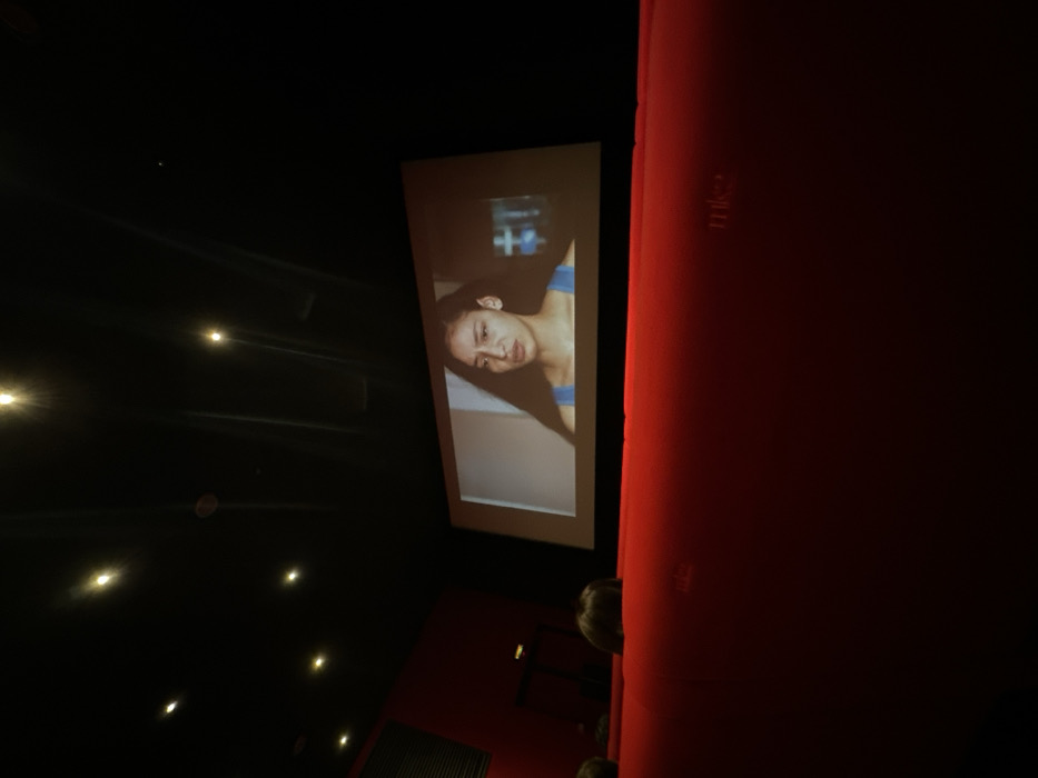 The image depicts the interior of a darkened cinema hall belonging to the mk2 chain, likely in Paris, France
