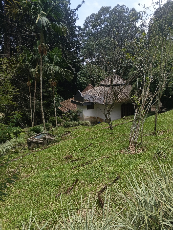 This scene in Baglung, Nepal, features a white building positioned on a steep, grassy incline. The structure has a multi-tiered roof covered with weathered reddish-brown tiles and a dark, ornate gable trim on its left side. Arched, dark-recessed windows are visible on the building's right-facing facade. To the left of the building, on a lower, level terrace, a rectangular concrete trough or planter, partially filled, is present. The foreground consists of a steeply upward-sloping expanse of light green grass with subtle darker striations. At the bottom-most edge, spiky, pale-green foliage is visible. Several slender, largely defoliated trees stand on the grassy slope directly in front of the building. Tall palm trees with green fronds are visible to the left and rear of the building, with a dense, dark-green forest forming the deep background. A clear, light-blue sky is visible at the top. No individuals or active subjects are depicted.