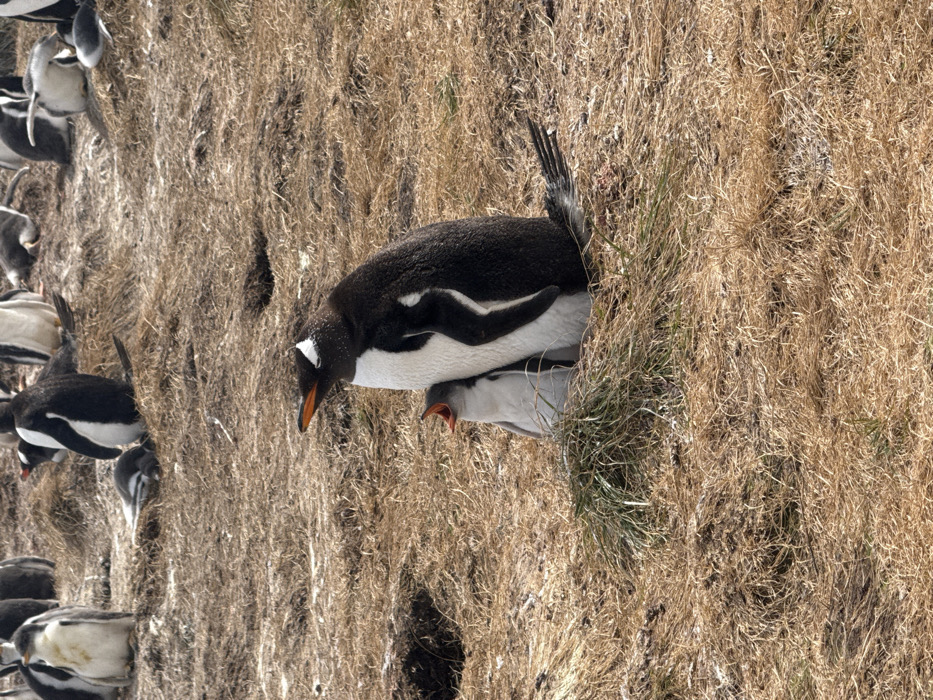 - "An adult Gentoo penguin and a chick stand on dry, yellowish-brown grassland within a larger colony at Bluff Cove, Falkland Islands (Islas Malvinas)" by FM-x6Qwo1, licensed under CC BY 4.0