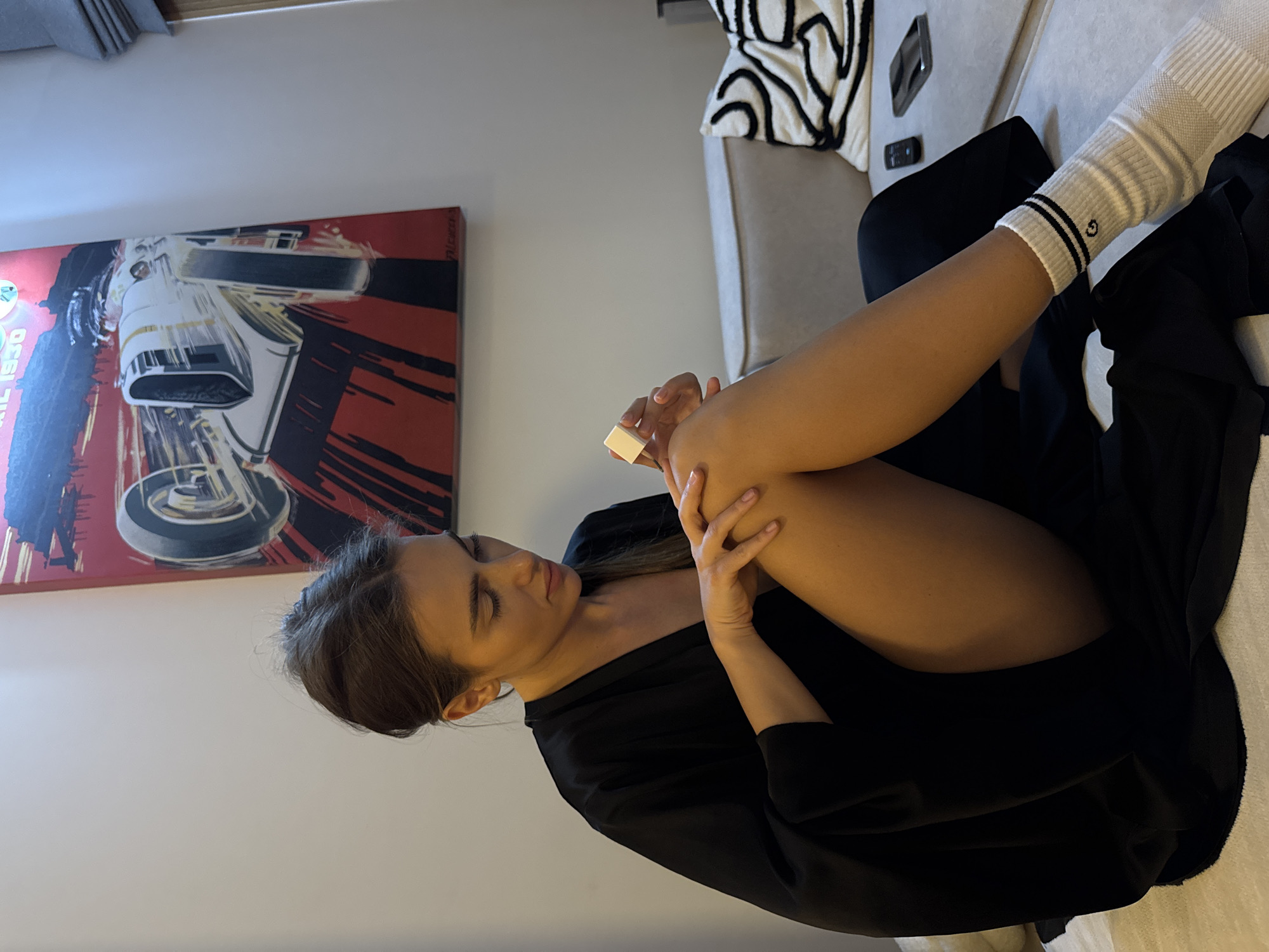 A woman is sitting on a couch in a room with a painting of a vintage race car on the wall. She is wearing a black robe and white socks with black stripes. She is holding a small white object in her hand and appears to be applying it to her leg. A striped blanket and electronic devices (a phone and remote) are also visible on the couch. There are no details to suggest it is located in Warsaw, Poland.