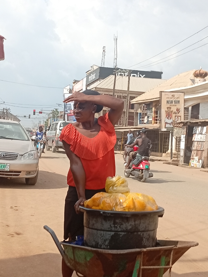 A middle-aged woman stands on a dusty road shoulder in Nnewi, Nigeria, positioned right of center