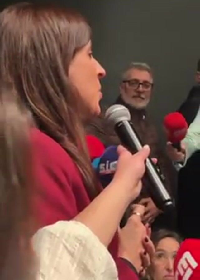 A woman with dark hair is speaking into several microphones. She is wearing a red blazer and is surrounded by people holding microphones. There is a man in a brown jacket and glasses standing behind her to the right, and another woman wearing a light green jacket behind her to the left. The background is dark and there are several people milling about, including cameramen and other reporters. One person is sitting in a wheelchair. The microphones are from various news outlets, including SIC and CMTV.