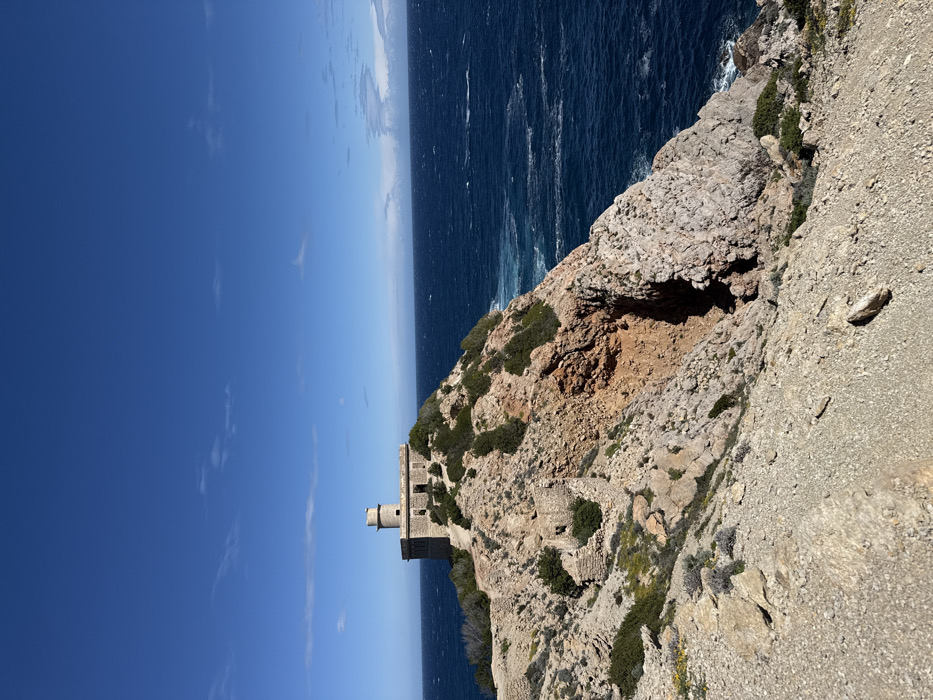 The image displays a panoramic coastal scene under a clear blue sky with minimal wispy clouds, situated in Sant Joan de Labritja, Spain. The central feature is a historic stone lighthouse or watchtower positioned on a rugged, rocky promontory jutting into the deep blue Mediterranean Sea. This structure comprises a cylindrical tower rising from a rectangular stone base, exhibiting several open, dark apertures that appear to be windows or doorways. A narrow, unpaved dirt path leads towards the building. The promontory itself consists of exposed light-colored and grayish rock formations, punctuated by patches of low-lying green scrub vegetation. A prominent section of reddish-brown rock is visible on the weathered cliff face. Further down the rocky slope from the main structure, the partial ruins of older stone walls are discernible. The sea exhibits a dark blue hue with visible white foam from waves crashing against the base of the cliffs and numerous whitecaps across its surface, indicative of active water movement. No individuals, animals, or modern vehicles are present within the frame.
