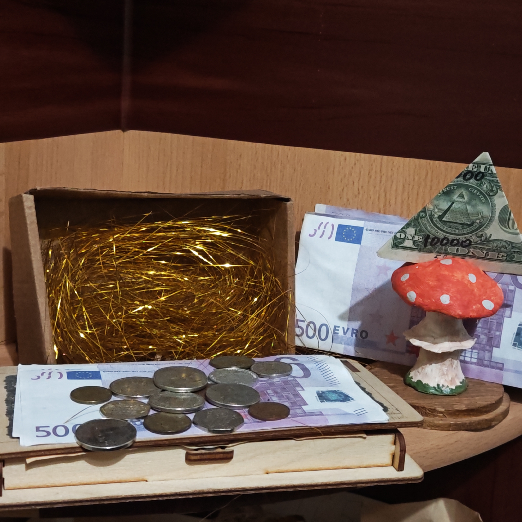 still life arrangement. A cardboard box filled with golden tinsel sits to the left. In front of the box, a stack of 500 Euro notes forms a base for loose coins. To the right, more 500 Euro notes are stacked with a one-dollar bill folded into a pyramid shape on top. In front of the pyramid, a red-capped mushroom figurine stands on a wooden base. The background consists of a wooden shelf or surface. There's no indication of the location being Rostov, Russia.