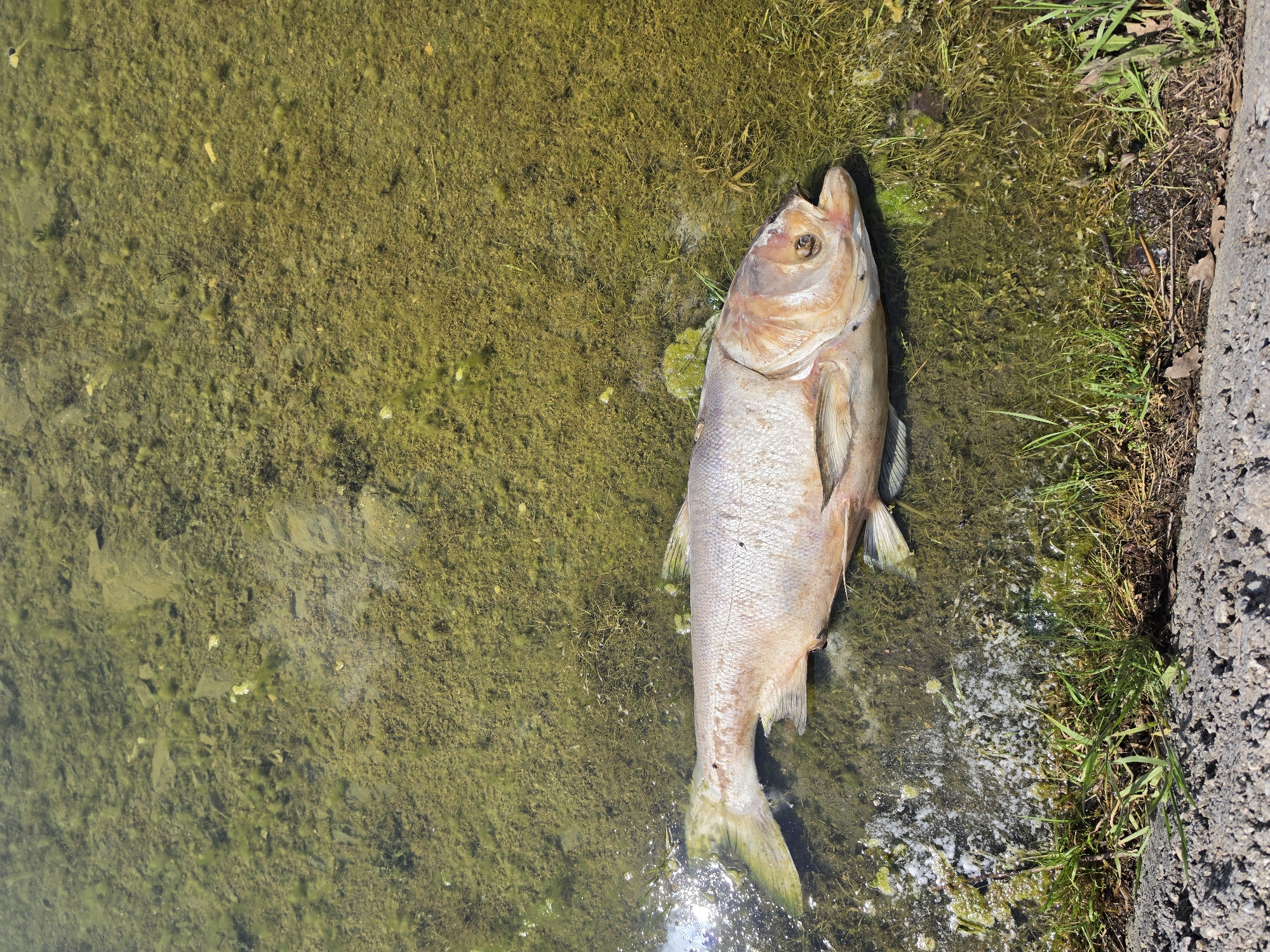 The image depicts a dead fish lying partially submerged in shallow, murky water alongside a concrete embankment