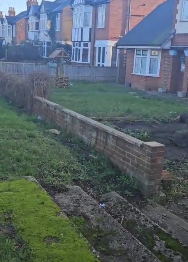 row of brick houses in a residential neighborhood. The houses are all two-story and have a similar architectural style, featuring brick facades, white-framed windows, and dark-colored roofs. In the foreground, there is a small, overgrown garden area. A low brick wall runs along the perimeter of the garden, and a set of concrete steps leads down from the higher ground. The steps are covered in moss and appear to be in disrepair. The garden is mostly grass, but there are also patches of bare earth and some dead plants. A decorative wishing well structure stands in one of the yards. The sky is clear and blue. The lighting suggests it is daytime, likely a sunny morning. There are no people visible in the video.