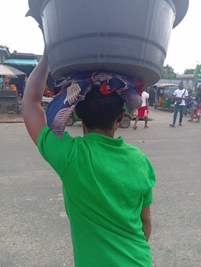 This image depicts an urban street scene in Aba, Nigeria, under overcast daylight. The central subject, viewed from behind, is a person with short, dark hair and an ear piercing visible on the left side of their head, wearing a green short-sleeved polo shirt. This individual is carrying a large, dark gray plastic bucket balanced on their head, cushioned by a folded fabric displaying blue, white, and red patterns. The person is walking on a gray, coarse-grained asphalt road surface. In the background, multiple other individuals are present, indicative of a bustling environment. One person in a white top and red shorts walks towards the left. On the right, a person in a white t-shirt and light blue trousers stands, holding a white rectangular electronic device. Several green and yellow auto-rickshaws (Keke Napep) are visible, some parked, others potentially in motion. Structures line the street, including a market stall with a light-colored umbrella on the left. On the right, a white sign with green lettering is partially visible, displaying text such as 'HAPPINESS GRAND' and 'STAY ALIVE OR...'.