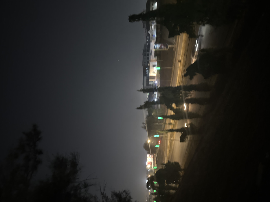 A blurry, nighttime view shows a roadside scene. Lights from buildings, street lamps, and vehicles streak along a dark road lined with trees. A crescent moon is visible in the smoky sky above the buildings. The image is out of focus, imparting a sense of speed and movement. The overall impression is that of a quick snapshot taken while in motion.
