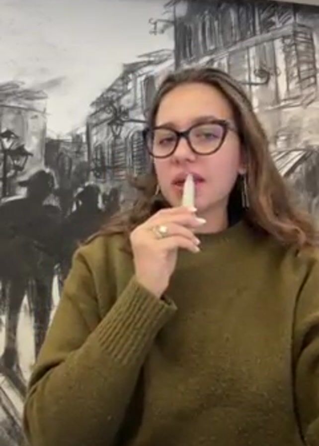 - "A young woman with curly brown hair and black-rimmed glasses applies lip balm and turns to gesture towards a black-and-white artwork behind her" by FM-iCfSu2, licensed under CC BY 4.0
