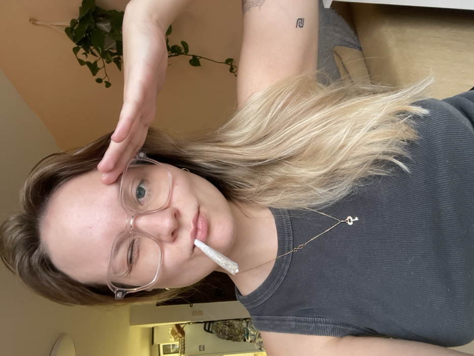 A fair-skinned female individual is depicted indoors in a residential setting, potentially in Tel Aviv, Israel. She has long blonde hair, wears clear-framed glasses, a dark grey ribbed tank top, and a gold necklace with a small key pendant. A small, dark, stylized '2' tattoo is visible on her left upper arm. She is looking directly at the camera, winking her left eye, with a rolled cigarette (joint) held between her lips. Her right hand is raised to her forehead in a saluting gesture. The background to her right consists of a light peach-colored wall with a potted green plant hanging, while the background to her left reveals part of an adjacent room with a white door, some shelves or counters, and a dark military-style backpack on the floor. A light-colored ceiling fixture is visible at the top left, and light brown furniture is partially visible in the lower right background.