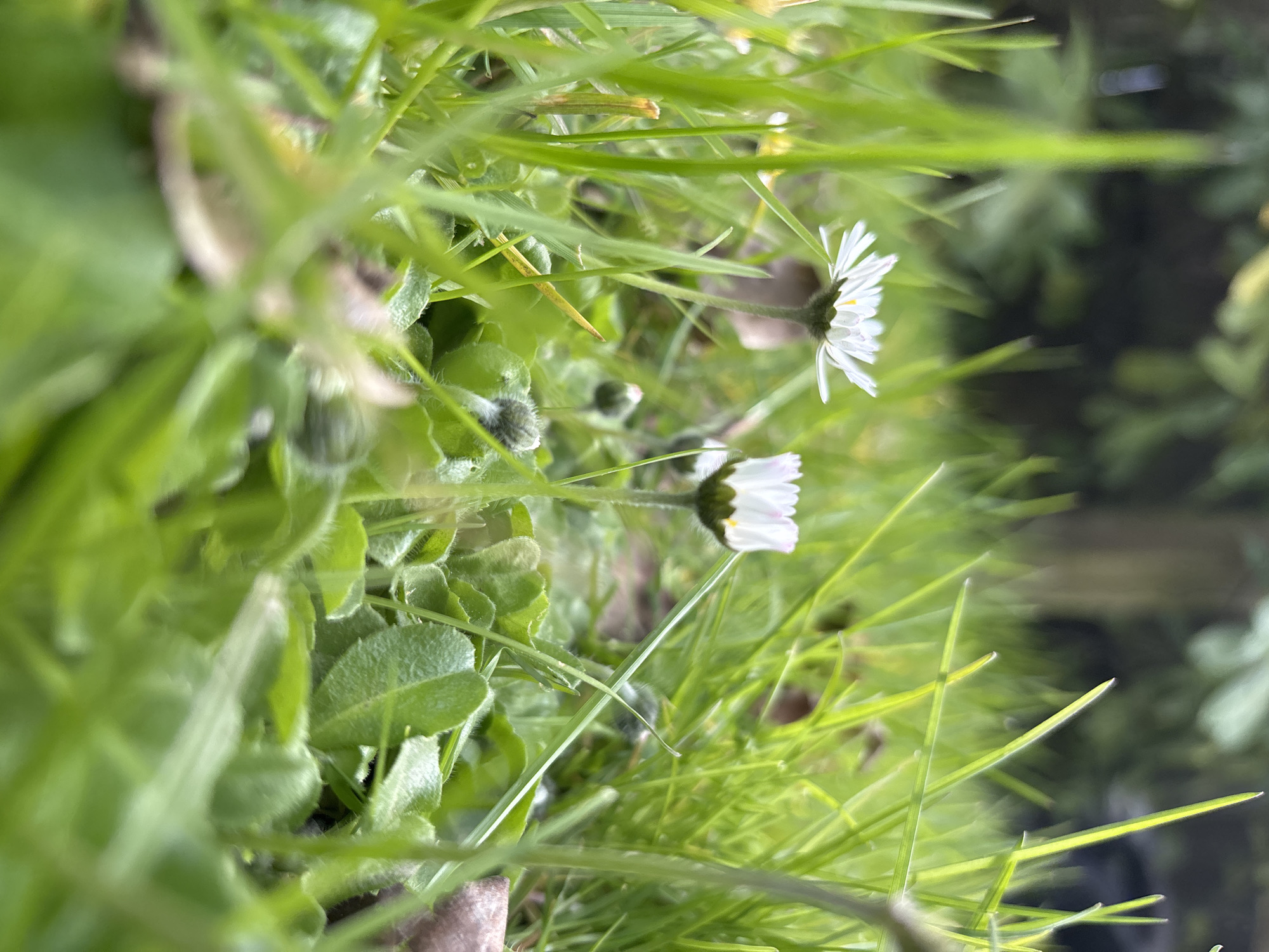 close-up of daisies and grass in Reigate and Banstead, United Kingdom. Two daisies with white petals and yellow centers are visible. They are surrounded by green grass and other plants. The background is blurred, suggesting a natural environment, possibly a garden or park.
