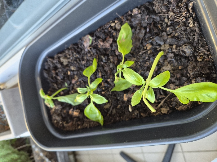 A rectangular dark grey plastic planter containing dark brown soil and four light green plant saplings is positioned on a tiled surface on a balcony in Viroflay, France. The saplings, consistent with basil, display signs of mild wilting. Background elements include a white tiled floor and a portion of a dark metal object to the left, and a reflective window pane to the right. The scene is illuminated by natural light.