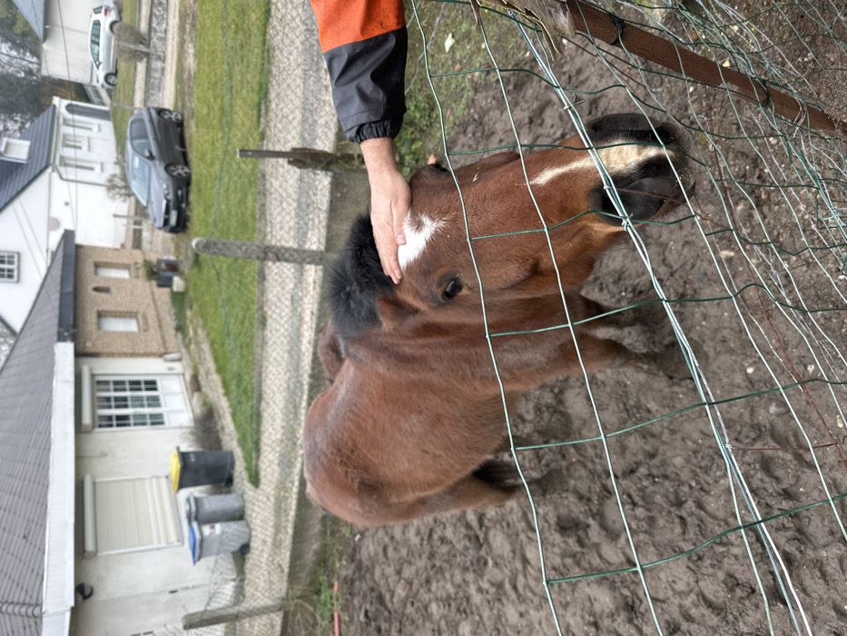 An outdoor scene in Lambres-lez-Douai, France, depicts a direct interaction between a human and an equine through a wire mesh fence. In the immediate foreground, a green wire mesh fence, reinforced with white strands, acts as a barrier. Beyond this fence, a brown pony-type equine, with a dark mane and forelock, and a prominent white blaze extending down its face, stands in a muddy enclosure. Its body is oriented towards the left, with its head turned towards the right. A human hand, with fair skin, extends from the right side of the frame, clad in a dark sleeve with an orange forearm section, resting upon the pony's forehead, indicating a petting action. The background features residential structures and vehicles. Directly behind the pony and fence is a house with a white stucco facade and a brown brick section. This house has white-framed doors or large windows and a closed roller shutter on another window. Two outdoor bins, one grey and one black with a yellow lid, are situated near the house. Further back, a dark grey passenger car is parked on a grassy area in front of another white house with a dark roof. A lighter-colored vehicle is partially visible in the far distance. The ground beyond the muddy enclosure consists of grass, with sparse trees and vegetation visible under an overcast sky.