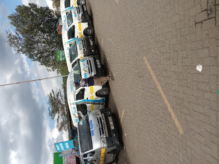 The image depicts a vehicle parking area in London ward, Kenya, under a partially cloudy sky