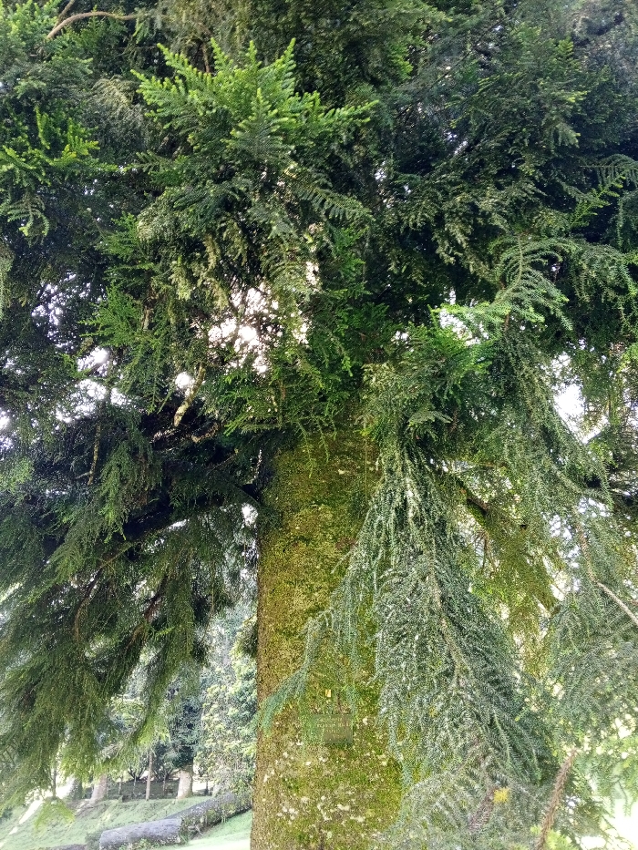 A tall, mature tree dominates the frame, its thick trunk covered in green moss. Its dense, dark green foliage creates a canopy, with bright sunlight filtering through the leaves. The branches extend downwards, adorned with hanging clusters of needles. The lower portion of the image shows a grassy field with scattered trees and stones in the background, suggesting a park or garden setting.