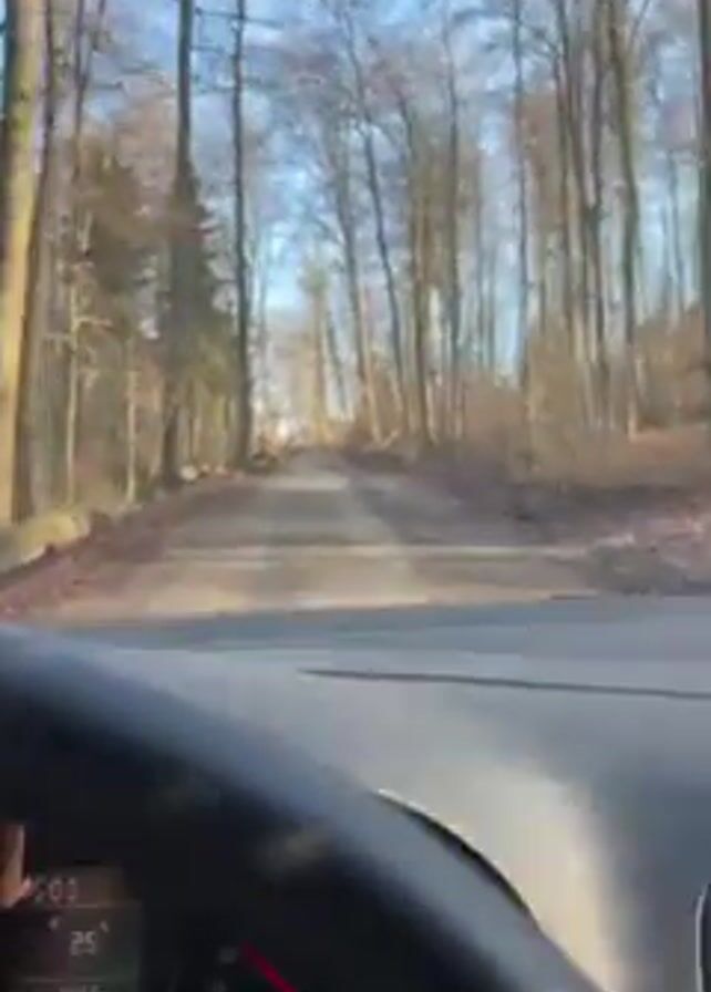 car driving down a narrow, unpaved road through a forest. The trees are mostly bare, and the sky is clear. The dashboard and steering wheel of the car are visible. There is music playing.