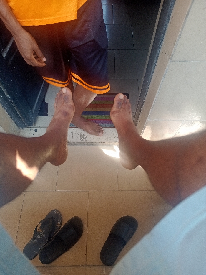 A first-person, downward-angle photograph depicts two individuals interacting at an open doorway in Unknown, Unknown. In the foreground, the bare lower legs and feet of the photographer are visible, partially obscured by light blue fabric. Their feet, exhibiting a dark skin tone with faint purplish discoloration, rest on light beige square floor tiles. A bright patch of sunlight illuminates the tiles and the photographer's left leg. On the tiles near the photographer's feet are three pieces of black footwear: one worn flip-flop and two slide sandals. One slide sandal is paired with the flip-flop, while the other slide sandal is positioned alone. Beyond the threshold of an open doorway, a second individual stands barefoot on a horizontally striped doormat. This person, also with a dark skin tone, wears an orange short-sleeved t-shirt and dark blue athletic shorts with two horizontal orange stripes. Their left hand is partially visible. The doormat features multicolored stripes, including green, blue, purple, red, orange, and brown. The floor inside the doorway is composed of darker gray square tiles. The door frame is dark gray and partially visible on both sides of the opening.