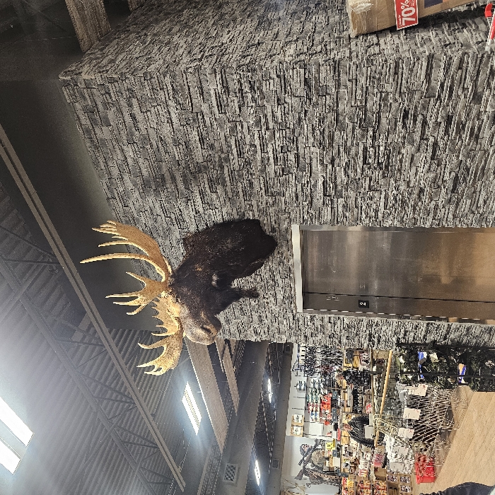 A moose head trophy with large antlers mounted on a stone-look wall next to a stainless steel elevator door marked with a "2." Above the elevator, a "70%" discount sign is visible. Below, a store interior showcases shelves stocked with various merchandise. The ceiling features a grid structure with lighting. The composition presents a blend of wildlife decor within a commercial setting.